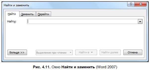 В области Редактирование находятся опции Найти, Заменить и Выделить. Рассмотрим их подробнее. ♦ Найти. С помощью этой опции вы можете найти слово или фразу в тексте. При ее выборе в Word 2007 открывается окно Найти и заменить (рис. 4.11), где нужно ввести искомое слово или фразу.
